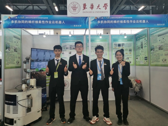 机械学院的“多机协同的棉纤维柔性作业云机器人”项目获得上海市一等奖。团队针对智能工厂机器人协同柔性作业的难题,提出了多合一柔性作业末端执行器、气电协同控制算法、云端调度系统,实现了高质高效协同作业。为智能工厂提供了一种多机协同的“云-边”互动解决方案,助力中国智造。