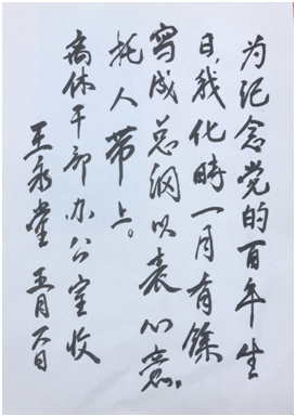 5月11日,学校老干部办公室收到由老同志家属送来的手抄《中国共产党章程》手稿,并附“为纪念党的百年生日,我化时一月有余,写成总纲,以表心意,托人带上”字条。书法作者系我校离休干部王永堂同志,今年97岁,党龄72年。厚厚的手写章程分为上下两册,以篆体书法抄写,用鲜艳的橘色纸张装裱封面,棉线手工装订,这些都是由王老亲手独立完成的。