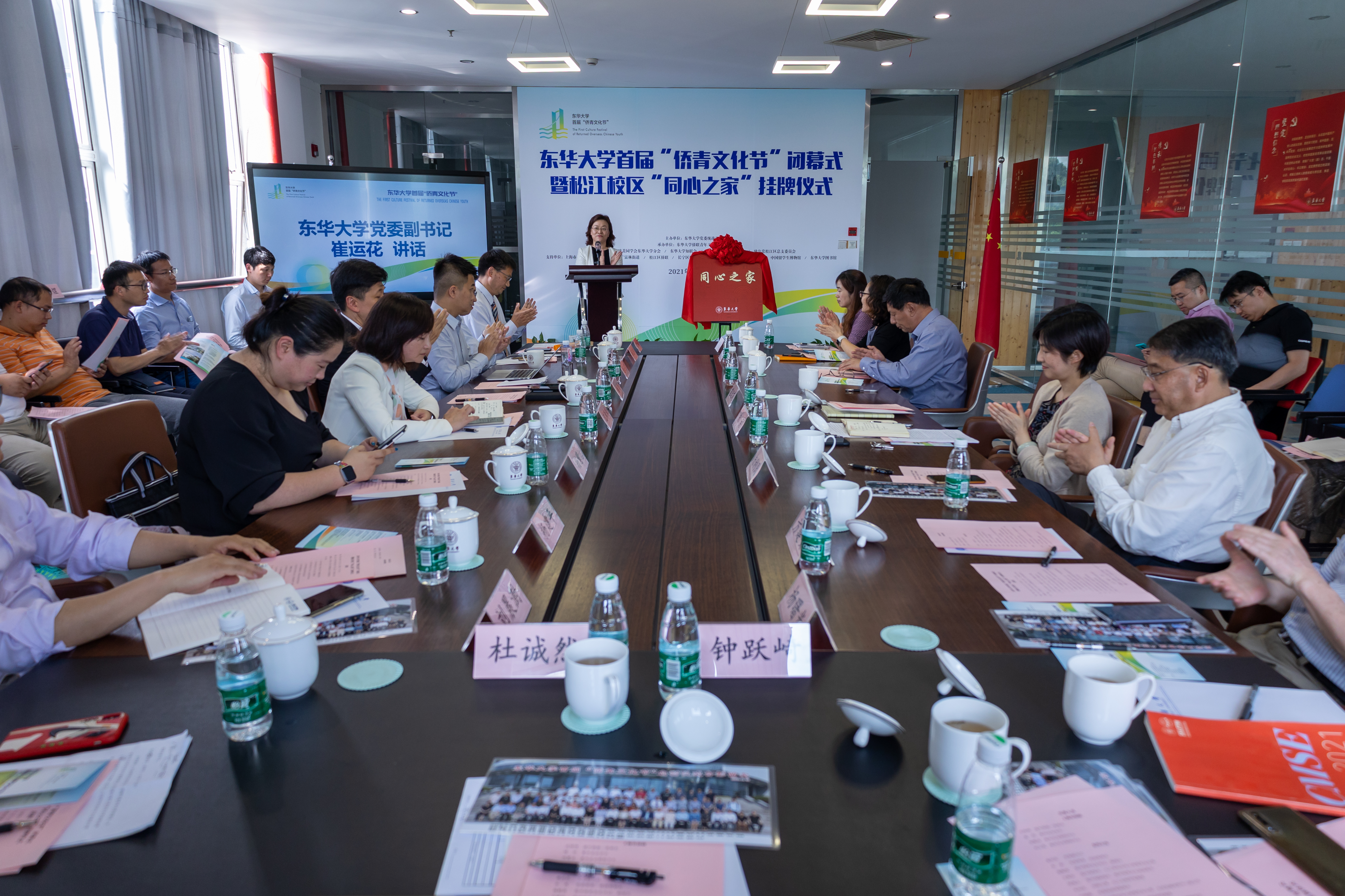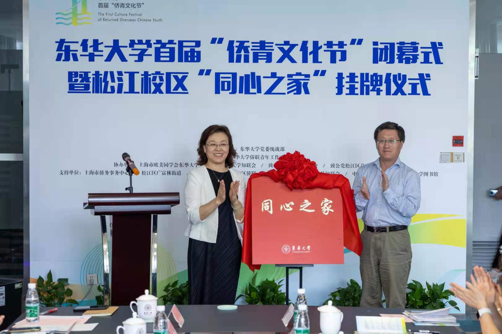 崔运花与方建安共同为“同心之家”揭牌。学校在松江校区图书馆内设立“同心之家”, 为各民主党派、统战团体成员提供开展学习、组织活动、座谈研讨和联络联谊的场所,更好地发挥统一战线的凝聚力、向心力和活力。
