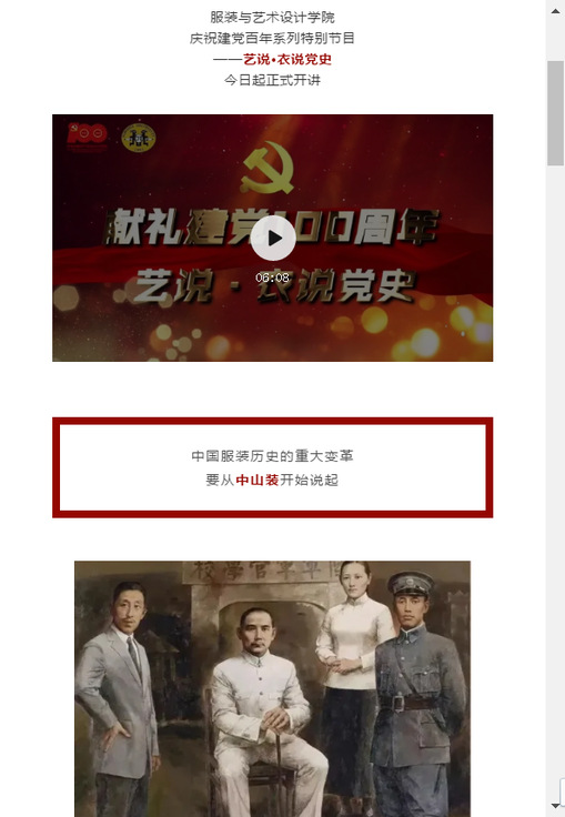 党史学习教育重在实效,面向广大青年师生的党史学习教育,尤其讲究温度与智慧。学院党委坚持小切口、高站位,聚焦专业的小知识点,将党史学习教育内容与学院专业特色有机结合,策划开设“艺说·衣说党史”专栏,师生联袂齐上党史大课,围绕中山装、文明新装、人民装、军装与工作装、国际化时装、功能服饰设计、时尚与创意服饰8类服饰,开设6堂党史微课,展现中国近代新历程。