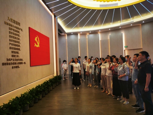 师生党员在讲解员的带领下开启寻访百年党史之旅。大家瞻仰了中共一大代表群像浮雕,参观了《伟大的开端——中国共产党创建历史陈列》序厅、“前仆后继、救亡图存”“民众觉醒、主义抉择”“早期组织、星火初燃”“开天辟地、日出东方”“砥砺前行、光辉历程”和尾厅等7个专题展区,详细了解了中国共产党为挽救国家和民族危亡进行的英勇斗争和艰苦探索。《共产党宣言》中译本、李白烈士修理电台的工具、《新青年》“马克思主义研究专号”……1000多件展品仿佛又带大家回到了那个风雨如磐的年代,大家驻足在一件件展品前,感悟光辉历史。下午3时,全体师生伫立在宣誓厅的党旗前,高举右臂,庄严宣誓“为共产主义奋斗终身”!鲜红党旗指引前进方向,铿锵誓言诠释不变忠诚。
