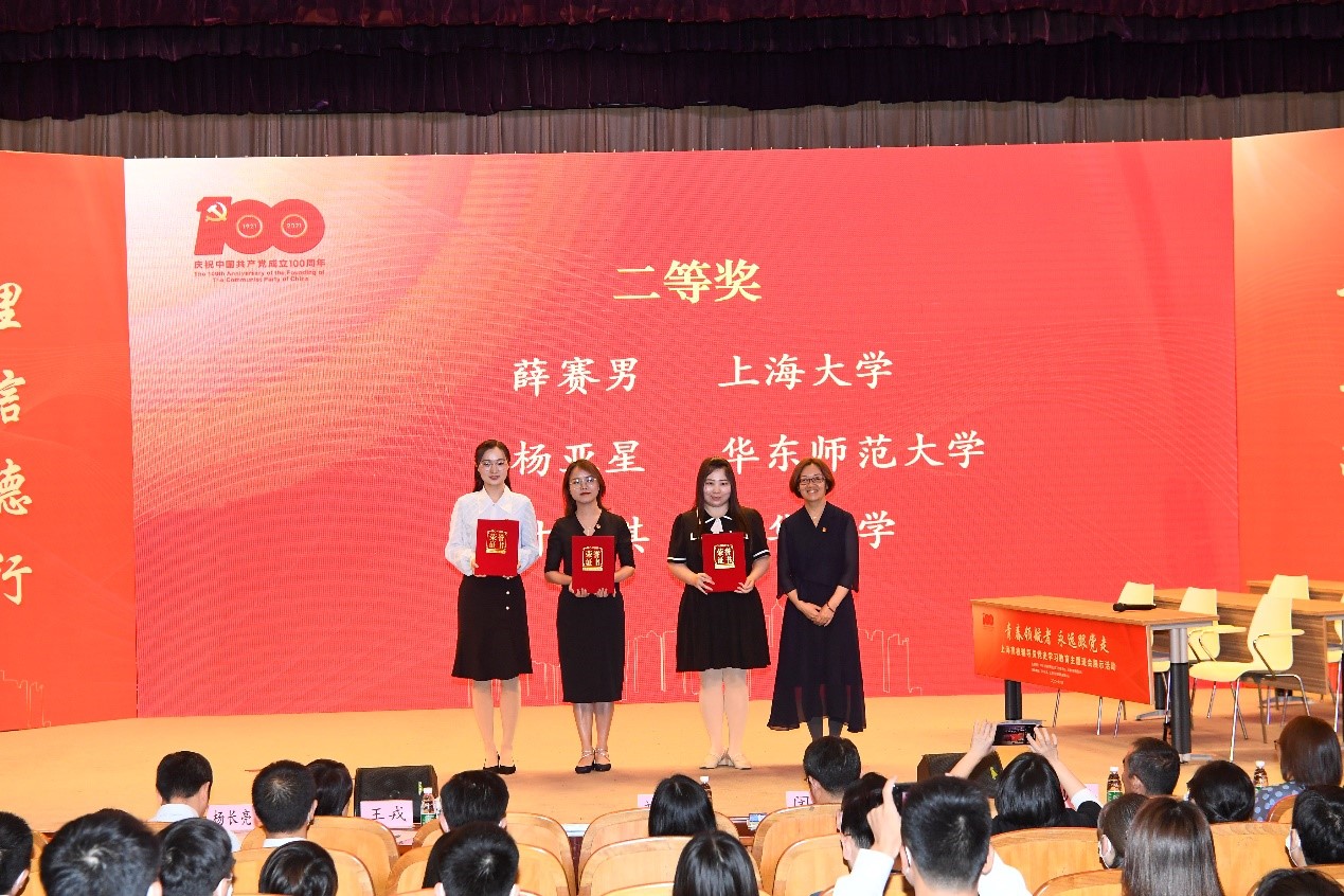 据悉,上海高校辅导员党史学习教育主题班会展示活动由市教卫工作党委、市教委主办,由我校和市学生德育发展中心承办,自2021年4月启动以来,全市共有44所高校的71位辅导员报名参赛,经过初赛教案评审、复赛现场说课和决赛现场班会展示,我校管理学院辅导员魏冰、纺织学院辅导员叶嘉琪分获一等奖、二等奖。
