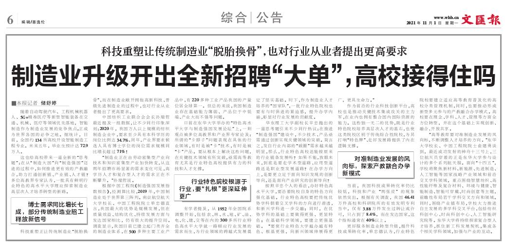 文汇报头条:制造业升级开出全新招聘“大单”,高校接得住吗