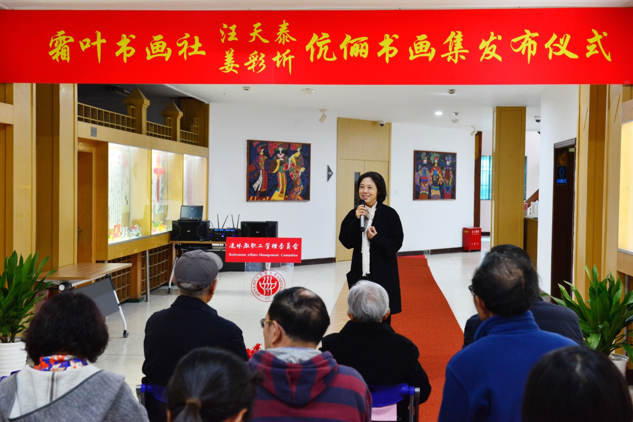 汪天泰对学校重视退休教职工的精神文化生活表示感谢,并介绍了夫妻两人的退休生活和学习情况,汪天泰、姜彩圻共同向书画社代表及所在的党支部代表赠送了画册。