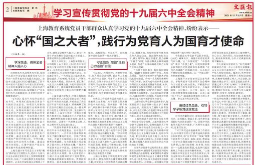 伟大成就催人奋进,宝贵经验昭示未来。在“两个一百年”奋斗目标的历史交汇期,党的十九届六中全会审议通过《中共中央关于党的百年奋斗重大成就和历史经验的决议》。连日来,上海教育系统广大党员干部群众认真学习全会精神,纷纷表示:习近平总书记在全会上的重要讲话思想深邃、内涵丰富、饱含深情、激荡人心,将深入学习贯彻全会精神,坚定信心,凝心聚力,心怀“国之大者”,坚守立德树人初心,践行为党育人、为国育才使命,奋力走好新时代赶考路,为实现第二个百年奋斗目标、实现中华民族伟大复兴的中国梦而不懈奋斗。