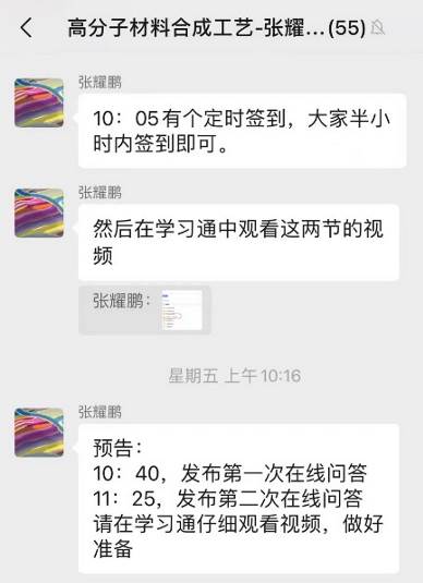 为保证高质量完成在线教学任务,材料学院的老师也“各显神通”,做足了准备。张耀鹏老师和范苏娜老师利用超星学习通、协同云、微信群、课堂派等多种手段确保“高分子材料合成工艺”在线教学的平稳有序进行,丰富了线上课堂中教师与学生的互动形式,并通过课上问卷、弹幕、小组讨论、随机点名等平台功能及时了解学生学习状态。