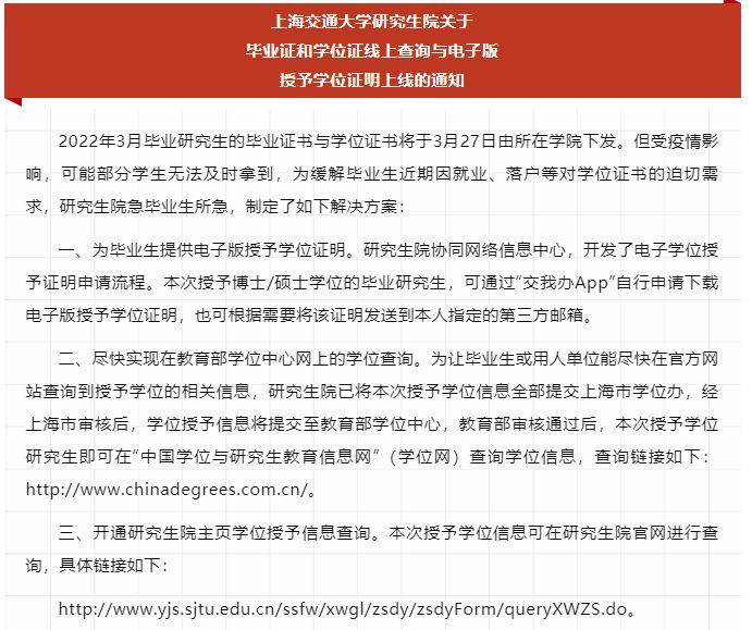 上海交通大学研究生院发布关于毕业证和学位证线上查询与电子版授予学位证明上线的通知。通知表明,2022年3月毕业研究生的毕业证书与学位证书3月27日由所在学院下发。