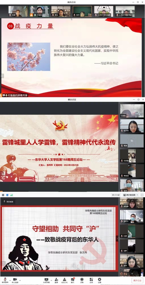 为贯彻落实习近平总书记关于学习雷锋精神和弘扬伟大抗疫精神的重要讲话精神,强化党员青春奉献、带头示范的责任担当,汇聚勠力同心、共克时艰的团结伟力,3月25日,人文学院学思先锋硕士研究生党支部开展第168期周五论坛——赓续共产党人精神血脉,战“疫”中谱写雷锋精神新篇章。学院党委书记韩哲宇、党委副书记资雪琴、学生工作办公室主任汪永安、党建辅导员穆莉、党支部全体党员和入党积极分子参加活动。