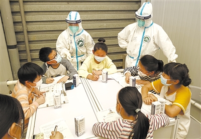 4月11日,上海新国际博览中心W2方舱,华中科技大学附属同济医院援沪医疗队队员,工作之余辅导方舱医院里的孩子们做作业。学校供图