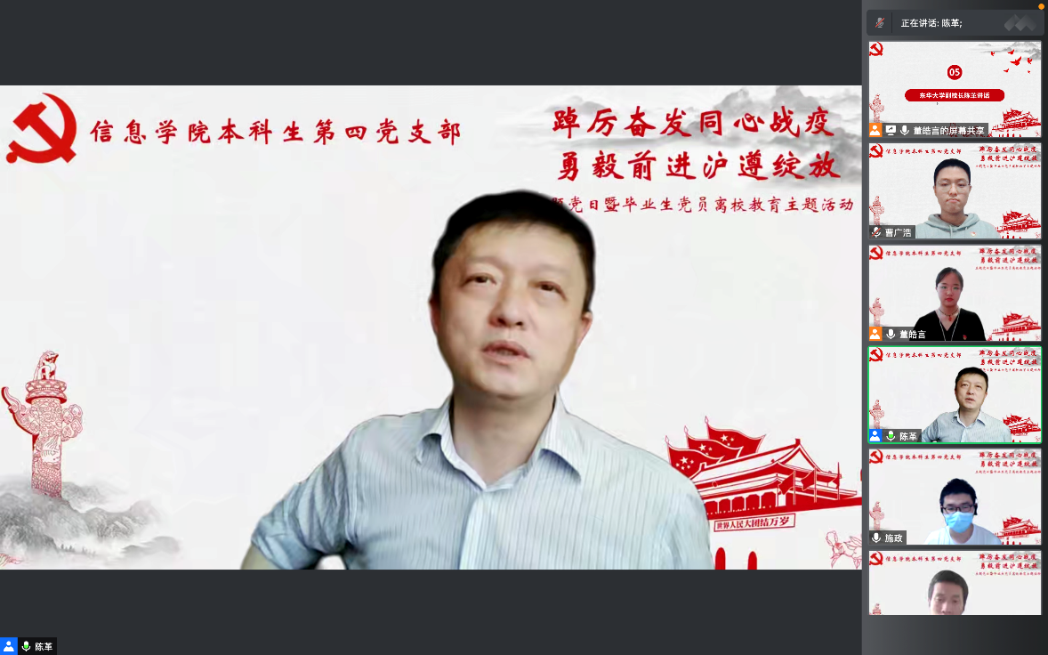 为深入学习贯彻习近平总书记在庆祝中国共产主义青年团成立100周年大会上的重要讲话精神,做好疫情防控背景下毕业生党员离校教育工作,5月27日,信息学院本科生第四党支部开展“踔厉奋发同心战疫 勇毅前进沪遵绽放”毕业生党员离校教育主题党日活动。副校长陈革出席活动,党支部全体党员参与活动,活动由党支部书记施政主持。
