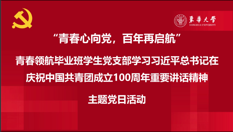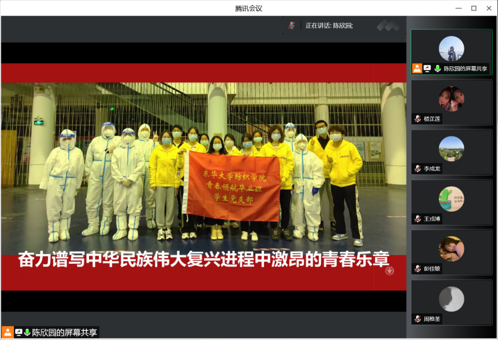 为深入学习贯彻习近平总书记在庆祝中国共产主义青年团成立100周年大会上的重要讲话精神,近日,纺织学院青春领航毕业班学生党支部通过线上会议的形式开展“青春心向党百年再启航”主题党日活动。副校长舒慧生出席活动,学院党委书记李成龙、院长顾伯洪以及党支部全体党员参加活动。活动由党支部书记陈欣园主持。