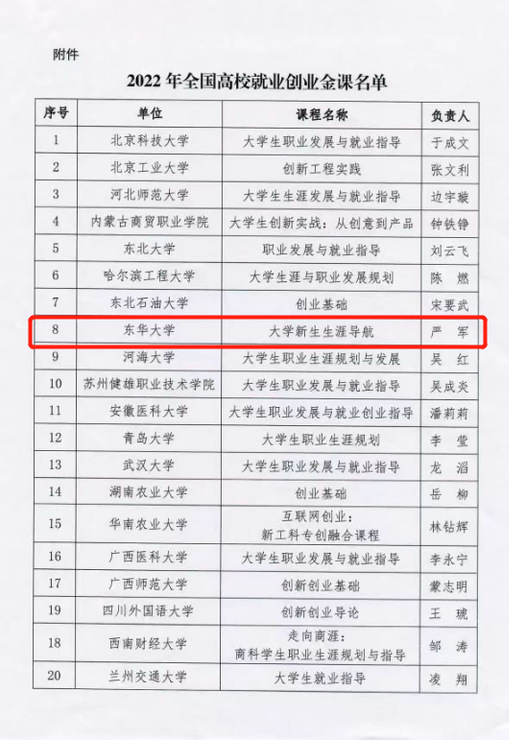 近日,教育部学生服务与素质发展中心下发《关于加强2022年全国高校就业创业金课建设工作的通知》,经高校申报、各省、自治区、直辖市教育主管部门推荐,由教育部学生服务与素质发展中心遴选,确定了20门课程为2022年全国高校就业创业金课。我校《大学新生生涯导航》课程位列其中,是自去年首次评选以来,上海市唯一入选的课程。