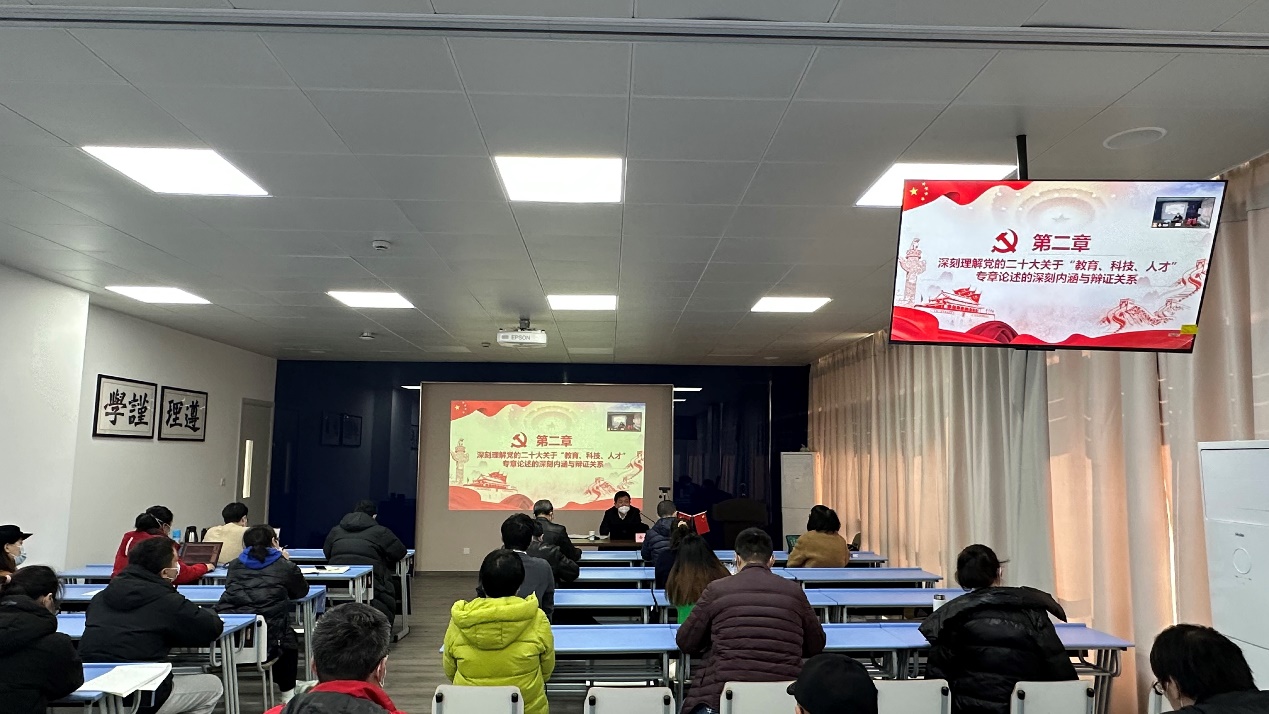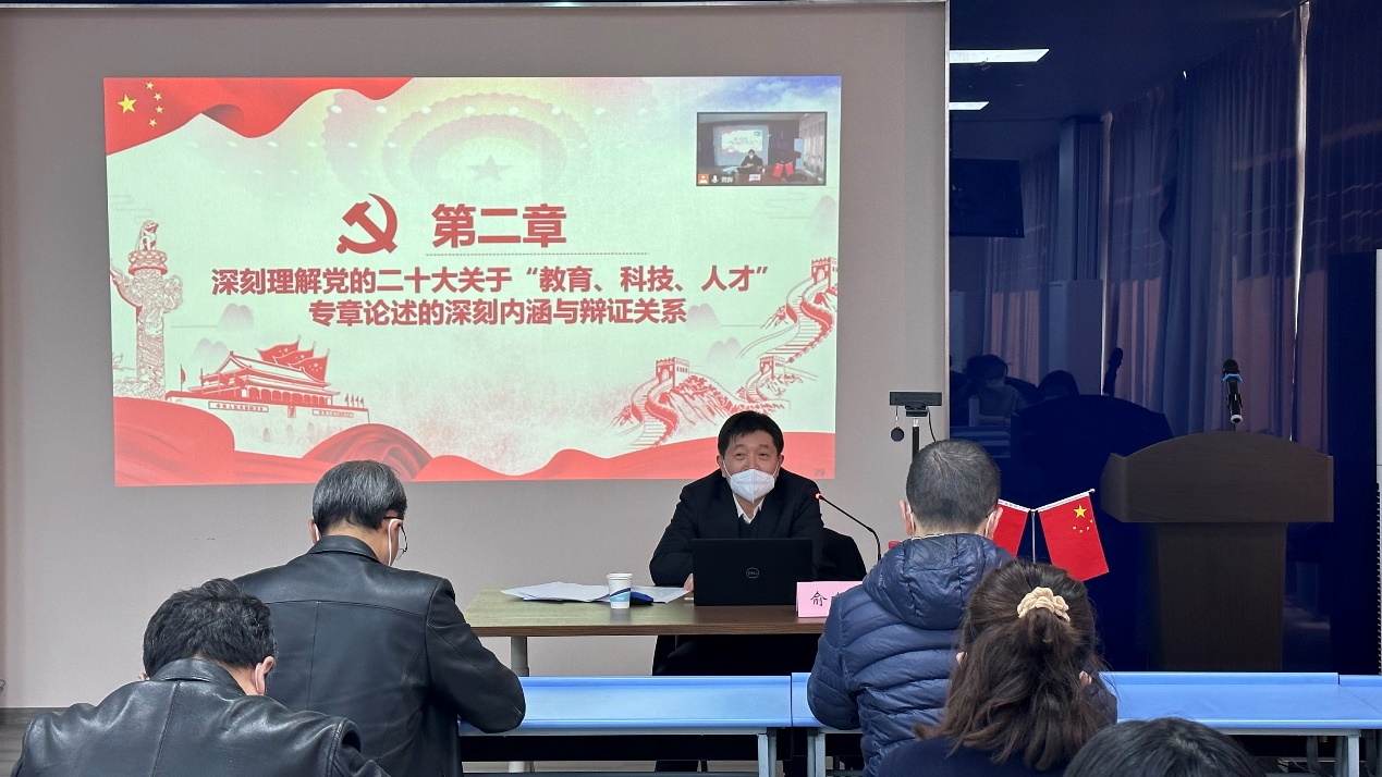 近日,校长俞建勇赴理学院,通过线上线下相结合的方式为全院教师作题为《学习贯彻党的二十大精神,凝心聚力推动学校高质量发展》党的二十大精神专题辅导报告,理学院全体教师参加学习,理学院党委副书记(主持工作)谢峰主持报告会。