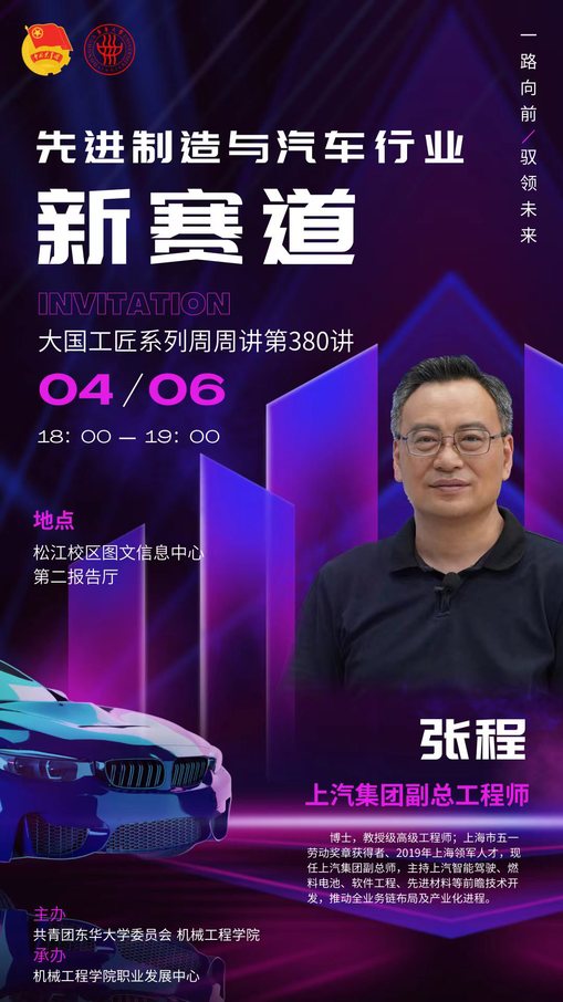 讲座介绍:讲座将结合个人成长、奋斗经历展开分享,用奋进故事的形式介绍主讲人领衔及主要参与的行业案例,主要有:(1)上汽集团“最后一公里”自主泊车项目;(2)上汽-同汶智能网联测评基地及智能网联测评体系;(3)整车智能驾驶关键技术的开发与测评体系;(4)上汽荣威950然料电池轿车所涉技术等。