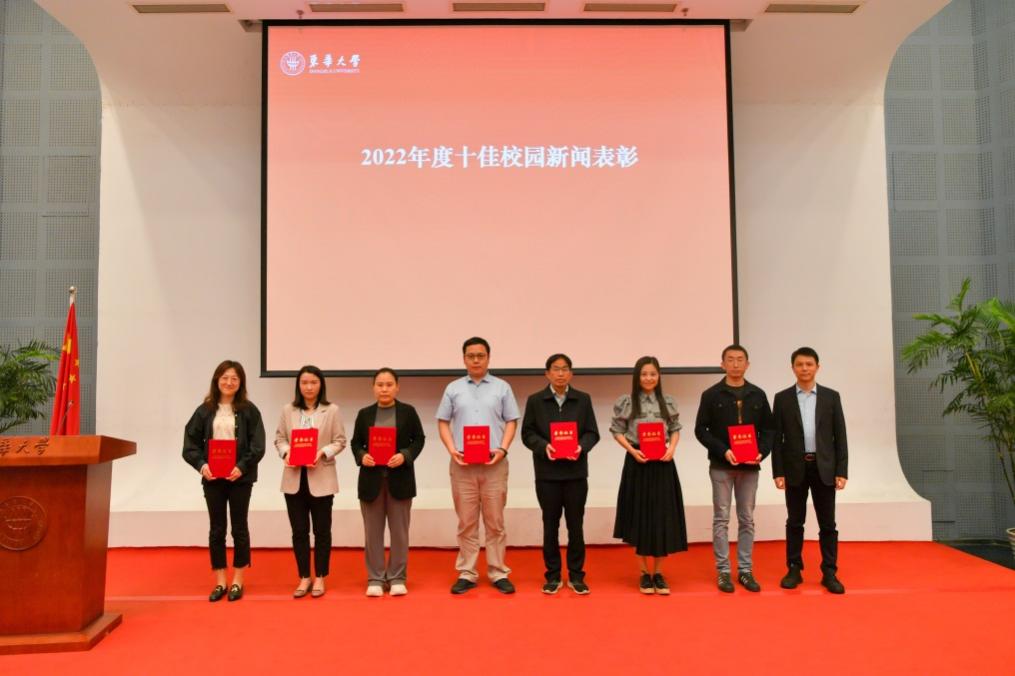 俞建勇在会上宣读表彰名单,会议表彰了年会优秀论文、十佳网文、2022年度十佳校园新闻、2022年度学生工作先进集体、2022年度学生就业创业工作先进集体以及“学习二十大 创文明校园”十佳文明实践主题活动案例。